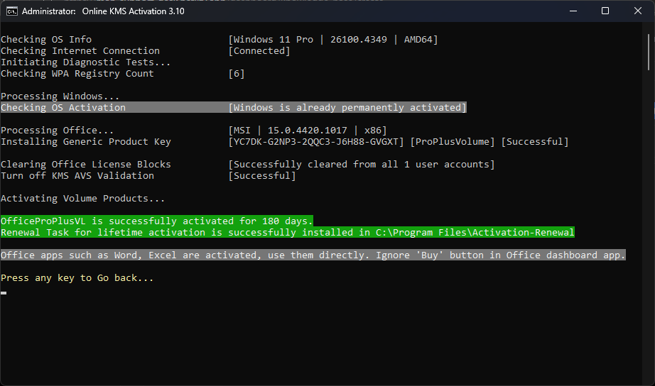 Note: This activation uses my Office production key store, which is linked to the laptop’s serial number. The correct key is automatically assigned based on the device.